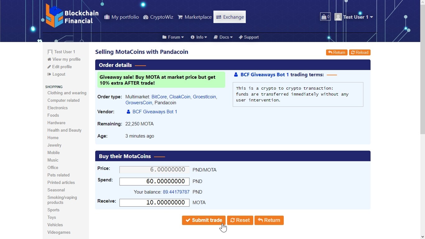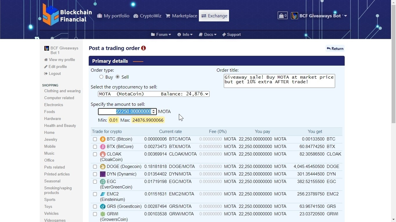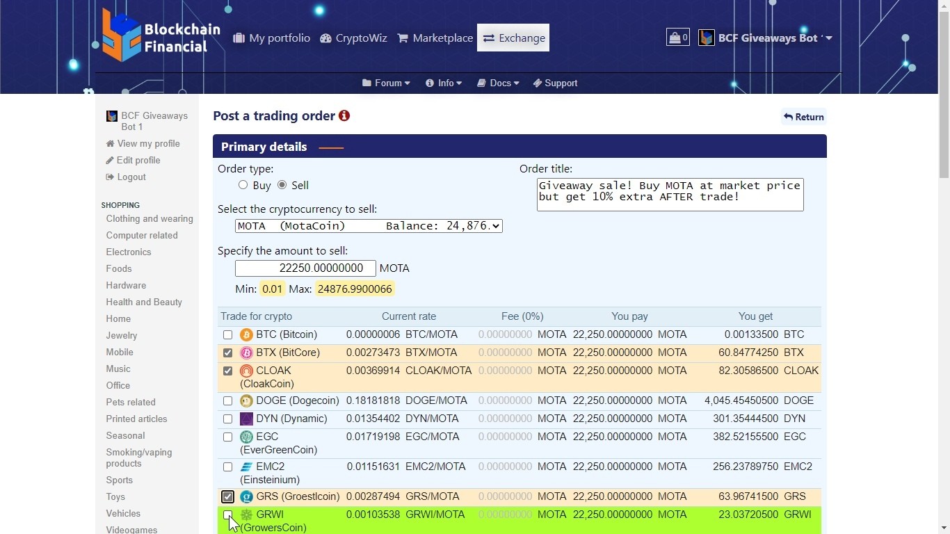 - The giveaway is set to 10%, and only 2 trades per user are allowed. This means that users will be given 10% back when giving coins on a sell order or will get an extra 10% of coins on a buy order.