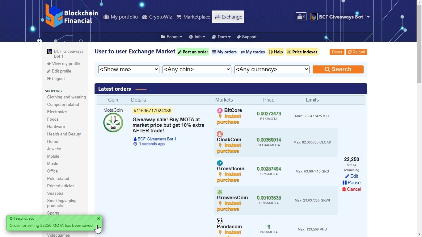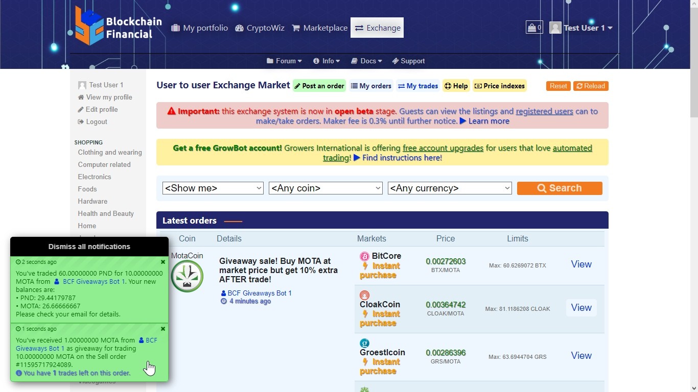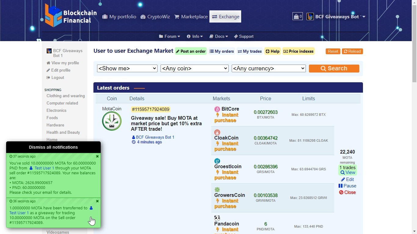 - The giveaway is set to 10%, and only 2 trades per user are allowed. This means that users will be given 10% back when giving coins on a sell order or will get an extra 10% of coins on a buy order.