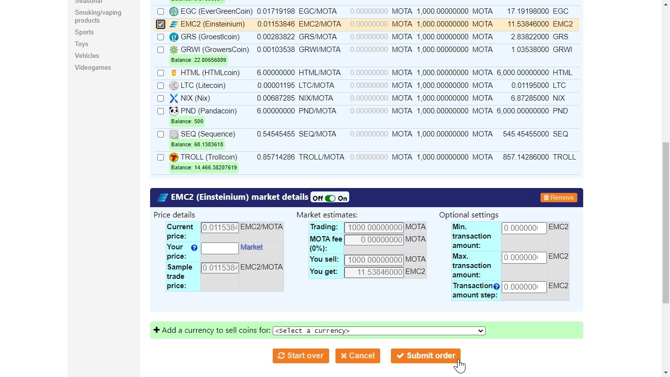 If you want to buy or sell a coin for another coin, you just pick the options and set the order settings: