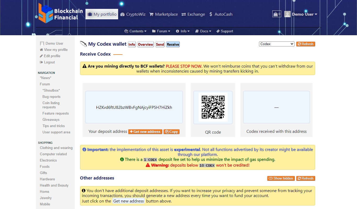 Here at BCF, Codex has been integrated so you can use your coins in our systems: