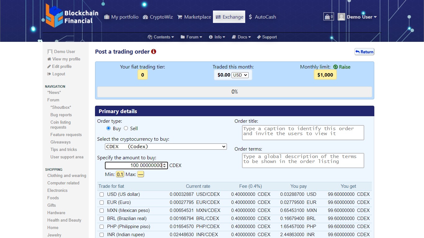 - Create a store in our marketplace and sell goods or services for Codex and other cryptocurrencies