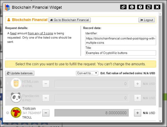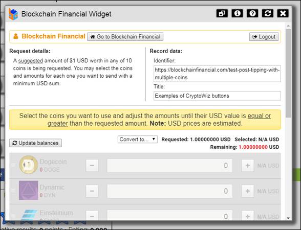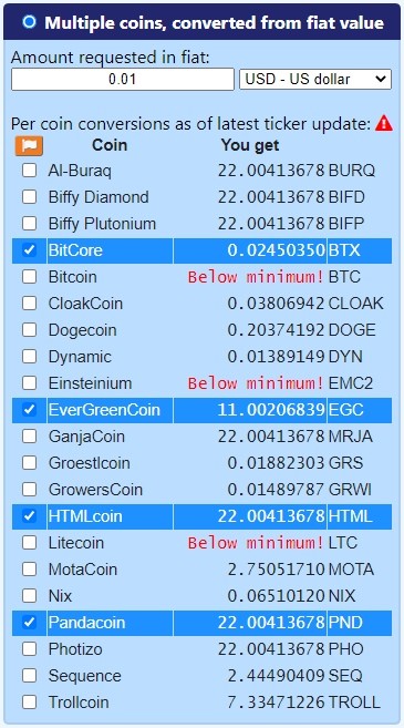 Finally, when suggested from USD is selected, the widget behaves just like the fixed from USD mode, allowing the user to select more than one coin and specify the amount to match the requested minimum: