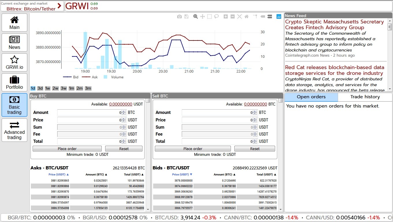 GrowBot has a basic trading facility for regular users. You can watch how the market moves, take some TA advice, manage your open orders and take a look at your trading history from the same screen.