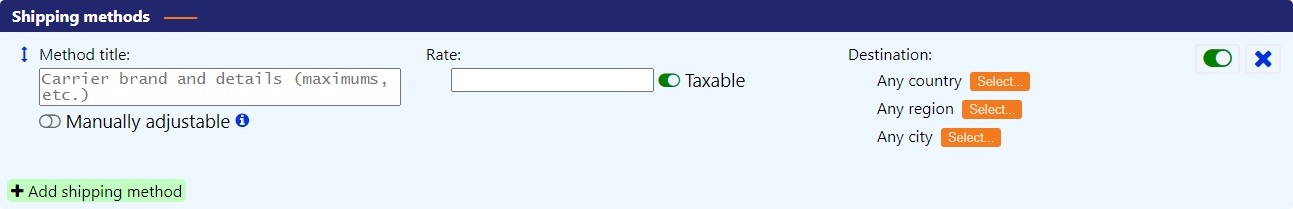 If you plan to sell physical items, you'll have to set at least one shipping method. You can define as much as needed, specifying rates as you see fit.