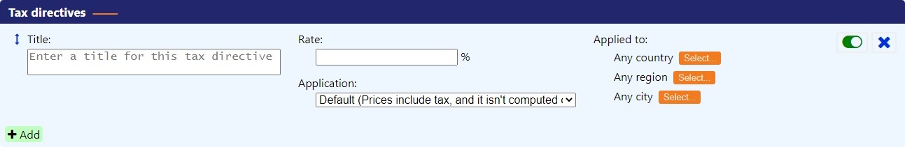 If you want to set tax information, you can set tax directives as needed. These can be applied down to city level, so if you want to specify different tax rates based on your shopper's location, it can be done easily.