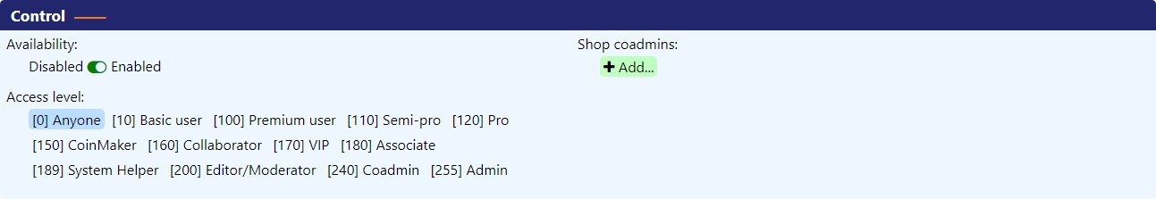 On this section you can enable/disable your store, name people to help you on it and restrict access based on user level.