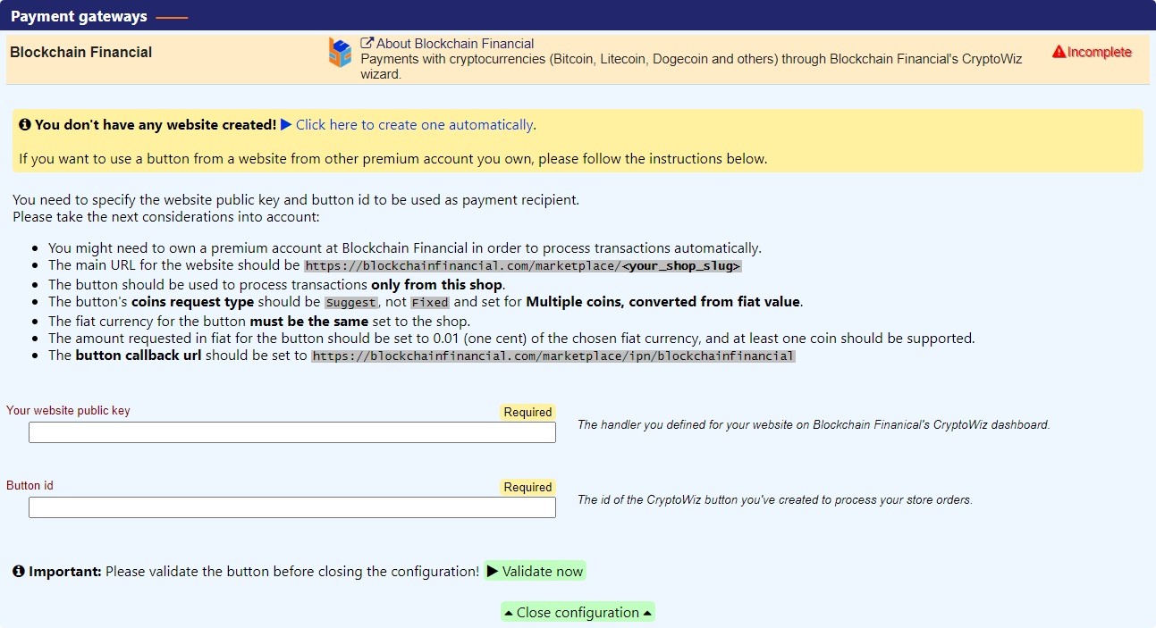 Just click on the link at the top of the form to have a website created for you on the CryptoWiz database and attach a button to it. That'll be enough to receive payments in all the cryptocurrencies supported by our website.
