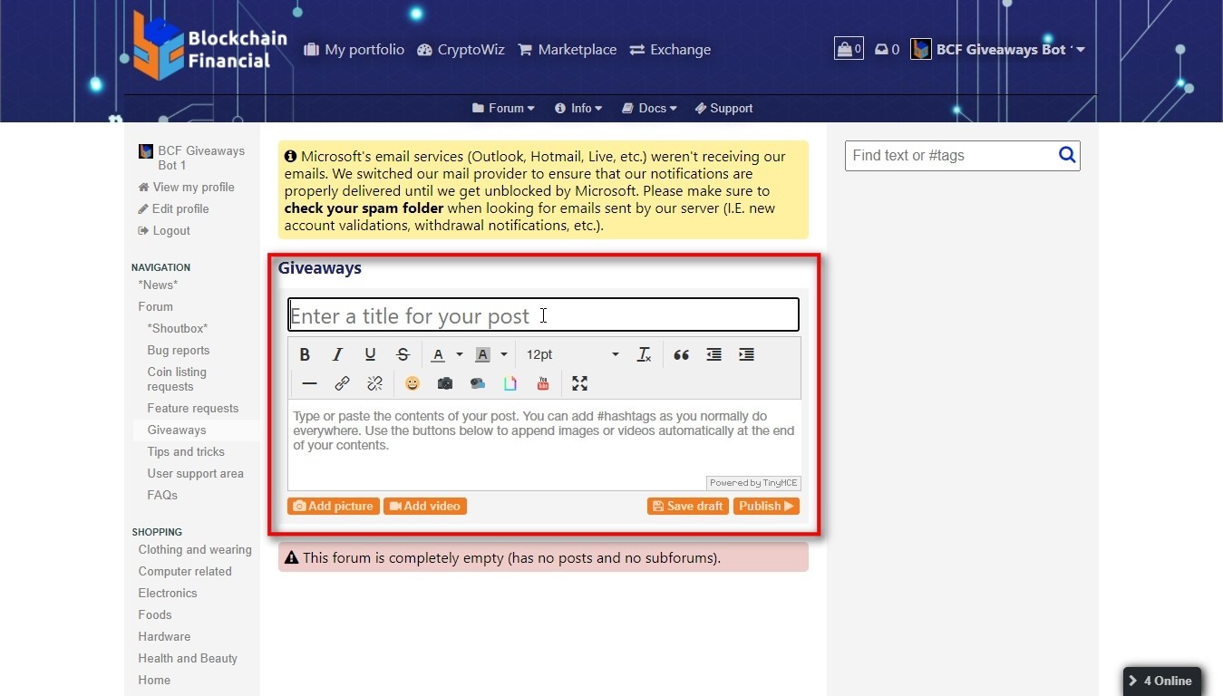 3. Type a title clear enough to make users click. Also, type in the contents area all relevant information about your giveaway, including rules. Take a look at the test giveaway post here for ideas.