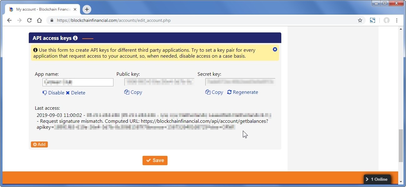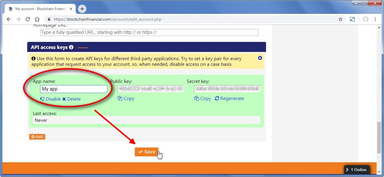 3. A public/secret keypair will be created. You just need to type in the name of the service you're adding for your reference and click on the "Save" button at the end of the page: