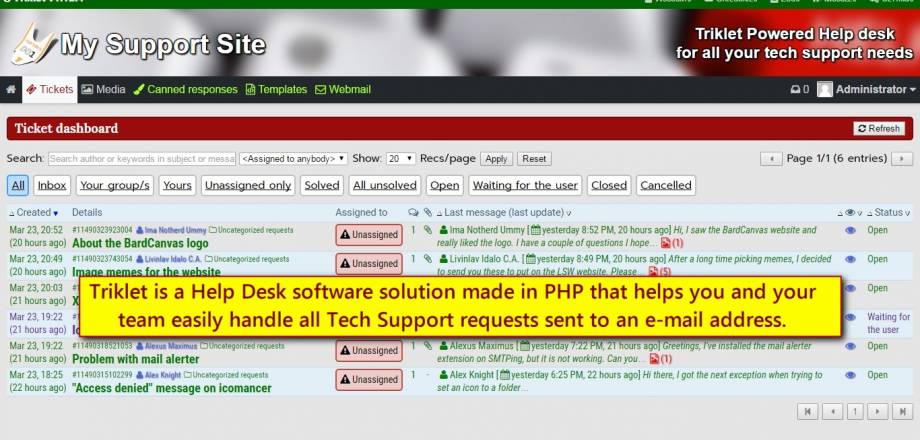 Triklet is a Help Desk software solution built for the LAMP stack (Linux, Apache, MySQL, PHP) with two primary goals in mind: easy to use and resourceful.