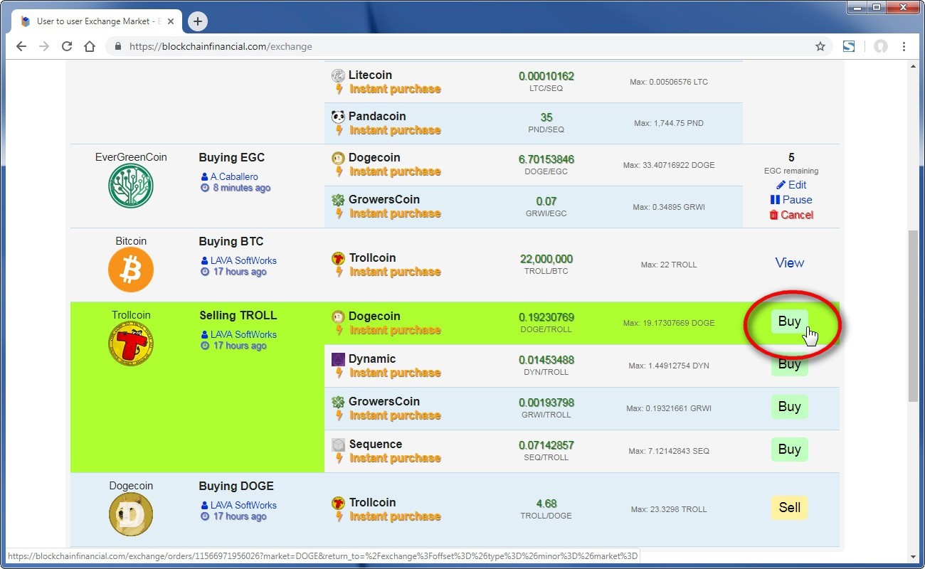 First, get into the exchange from the main menu. You'll get into the main listings. Filter out if needed and hit on the "Buy" or "Sell" button at the right of the table: