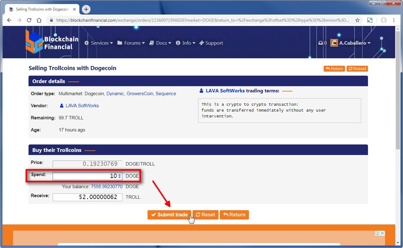 Just type the amount of coins you wish to trade and click on the big "Submit trade" button at the bottom.