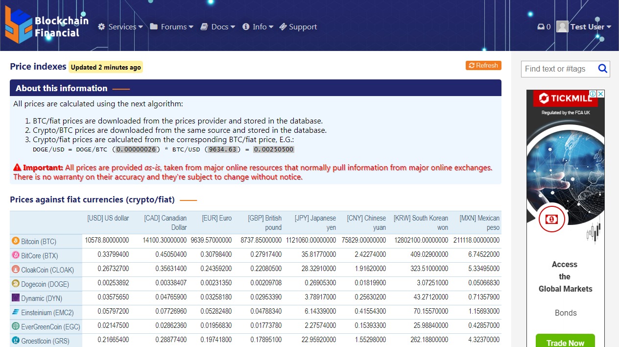 We added a price indexes page that shows the latest rates for all the supported coins pulled from external sources and the computed ratios for all operations: