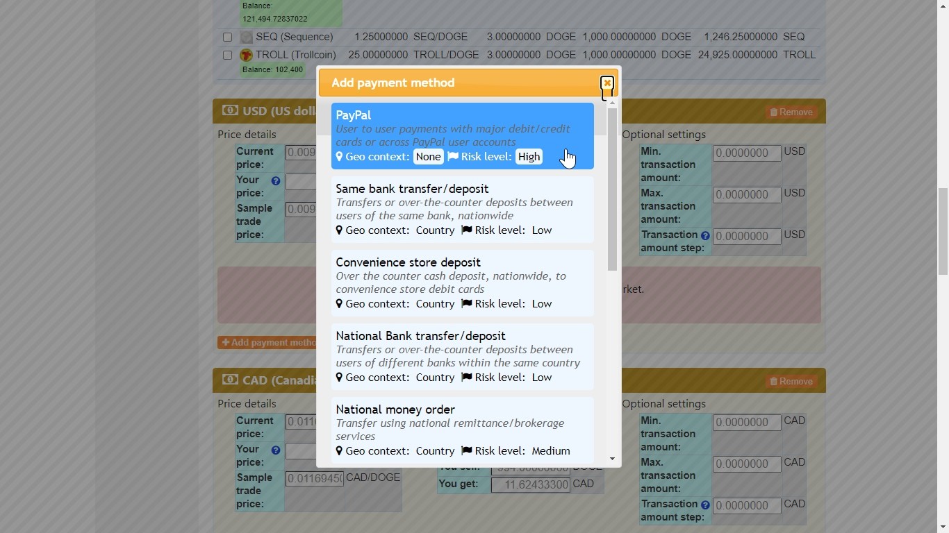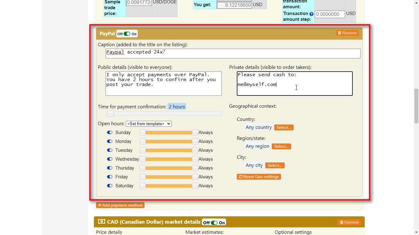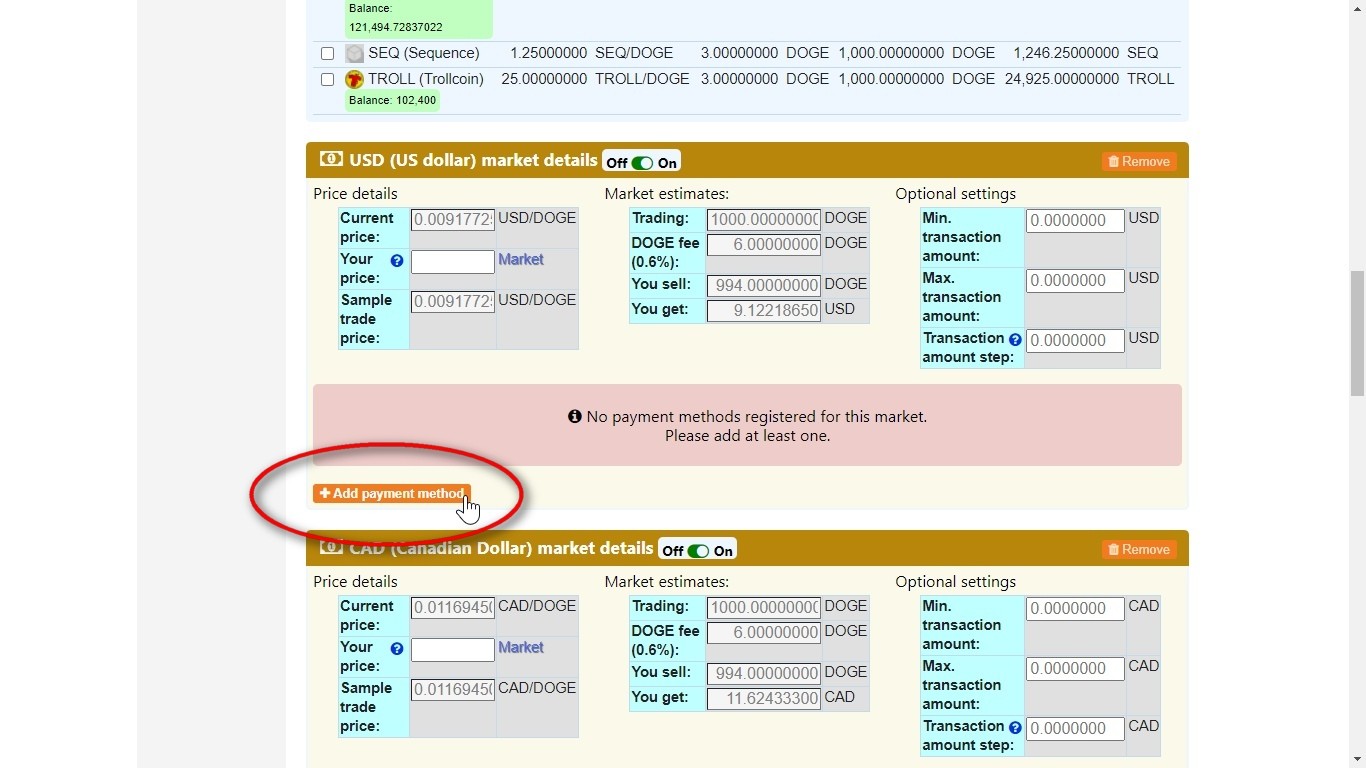 Now, on crypto/fiat markets, you need to specify at least one payment method for each market: