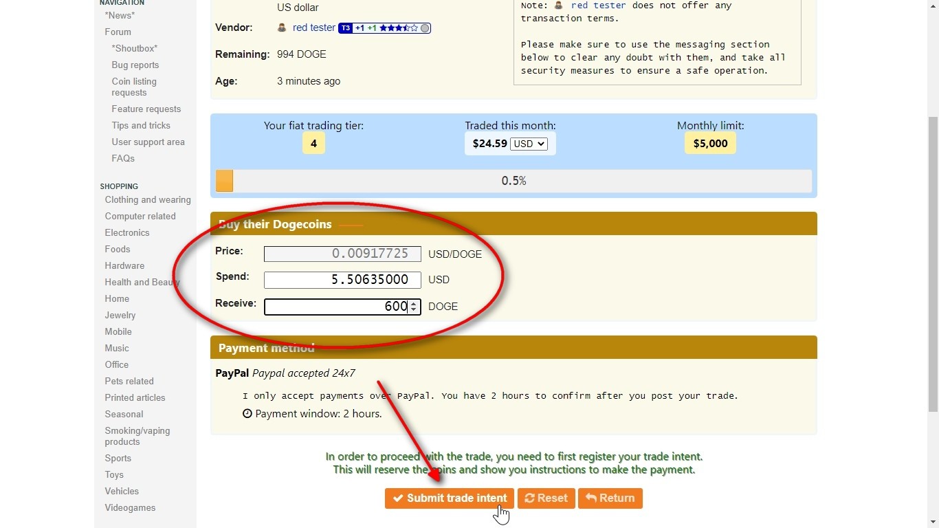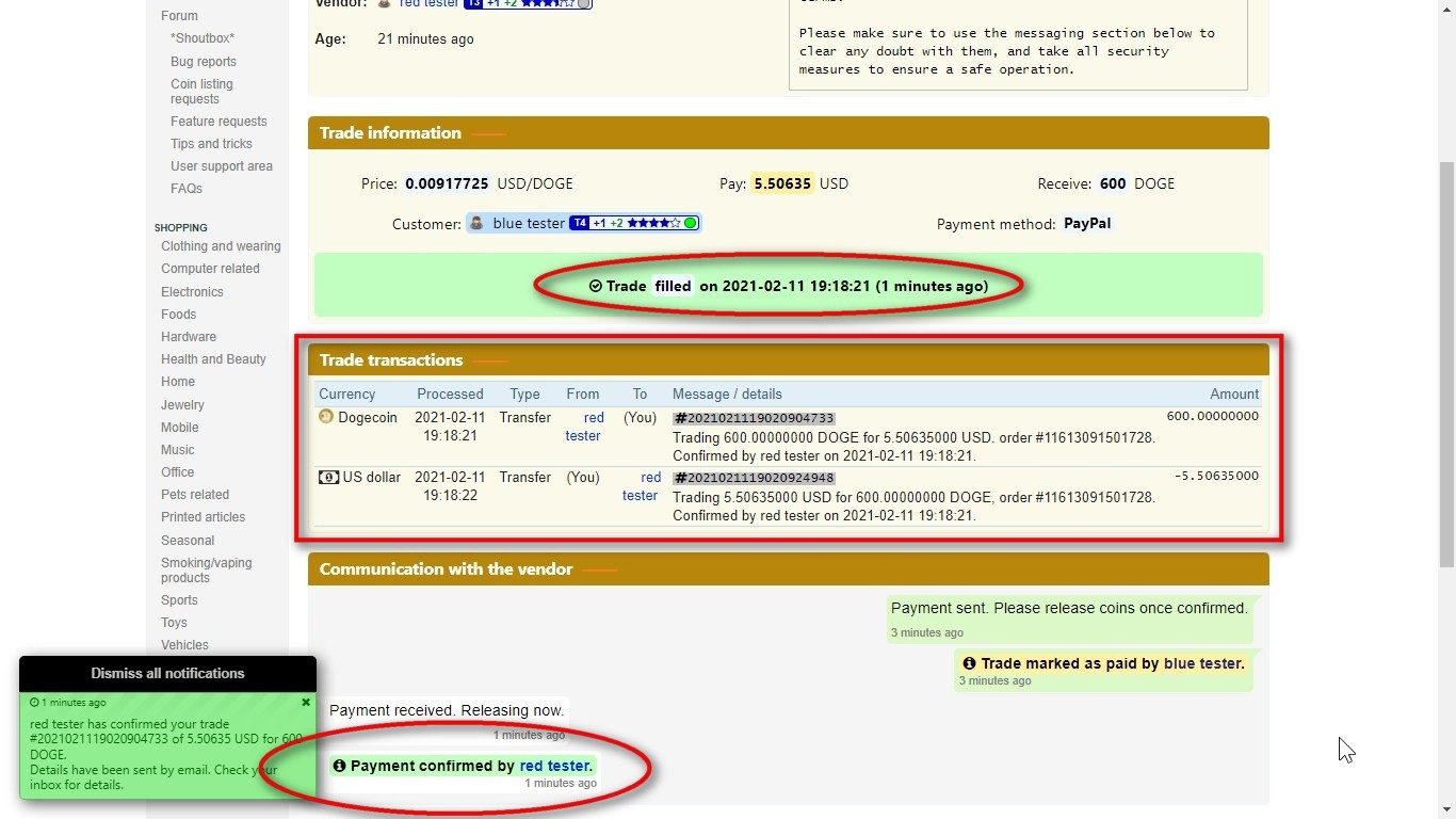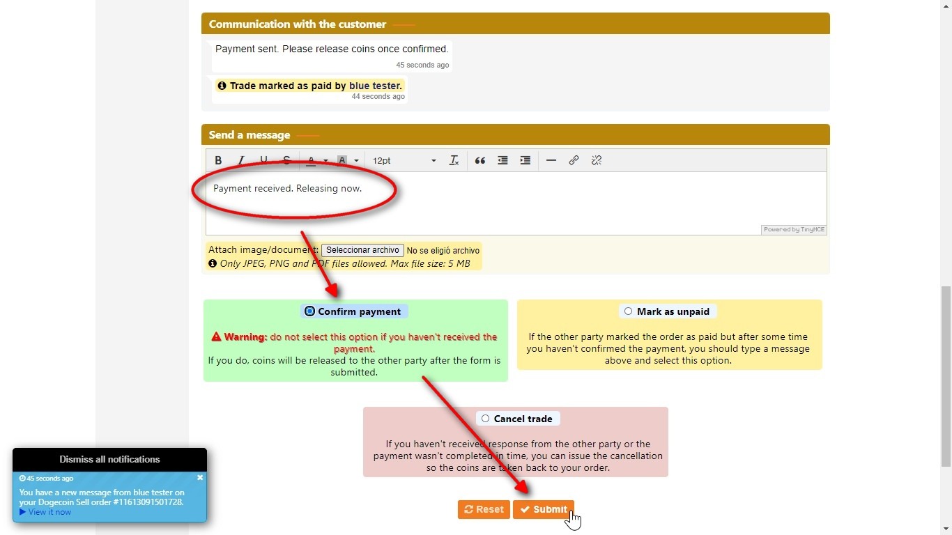 6. Once you receive the payment, you need to confirm it in-trade, sending an optional message: