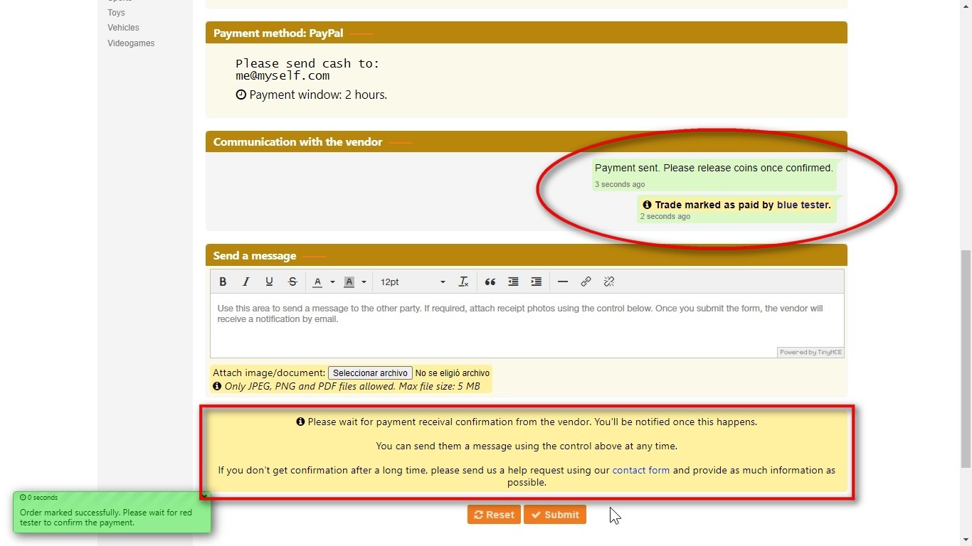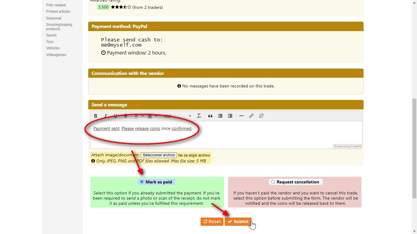 4. Depending on the payment type, the customer might need to notify you using the in-form conversation and mark the trade as paid:
