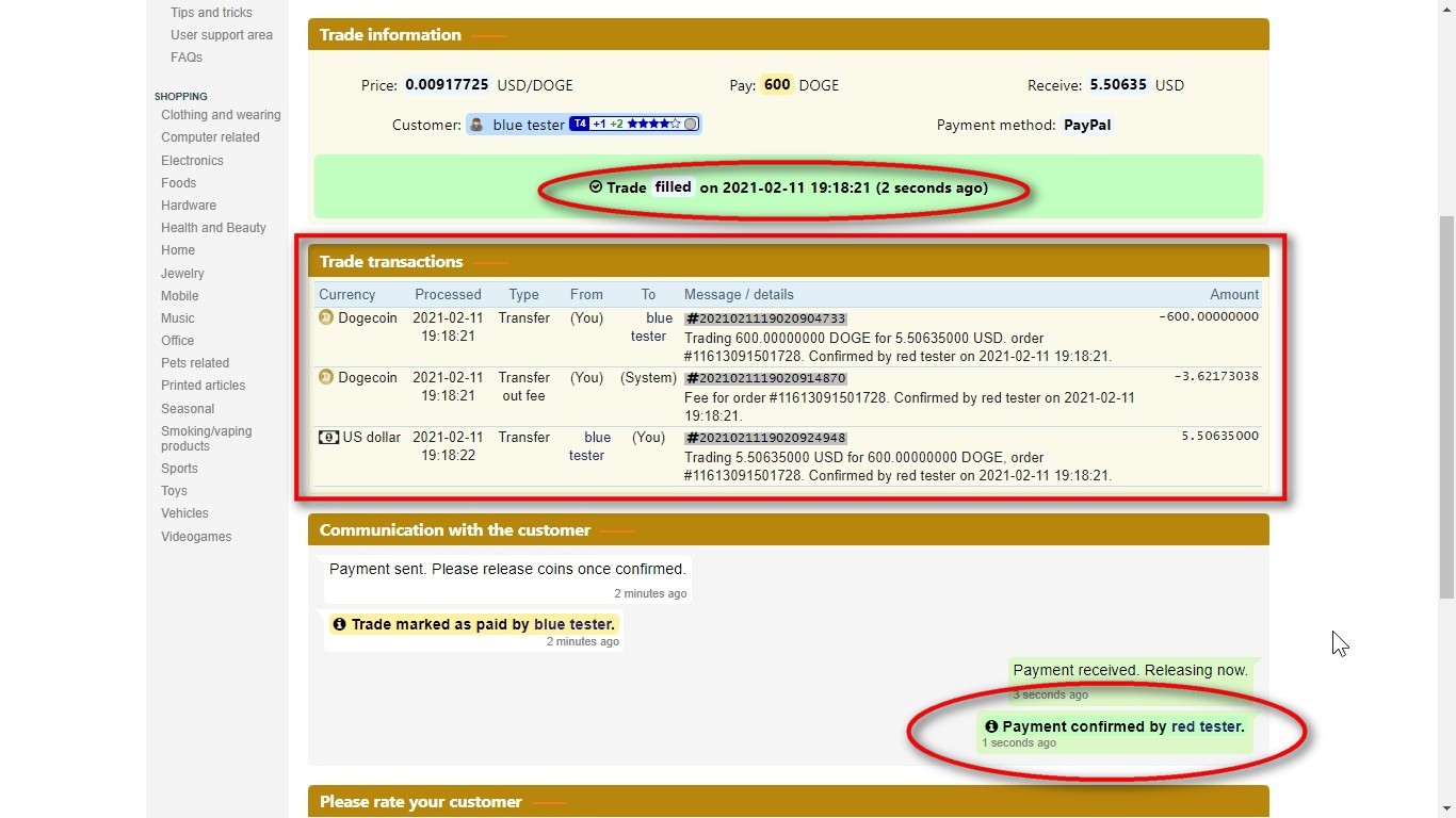 7. After confirming the payment, you cansee the transactions flagged as completed and the trade flagged as filled.
