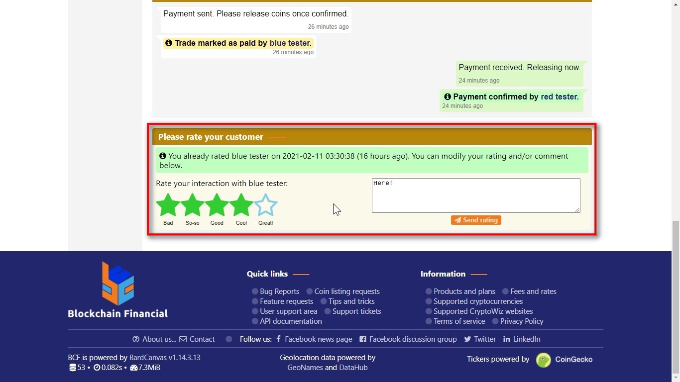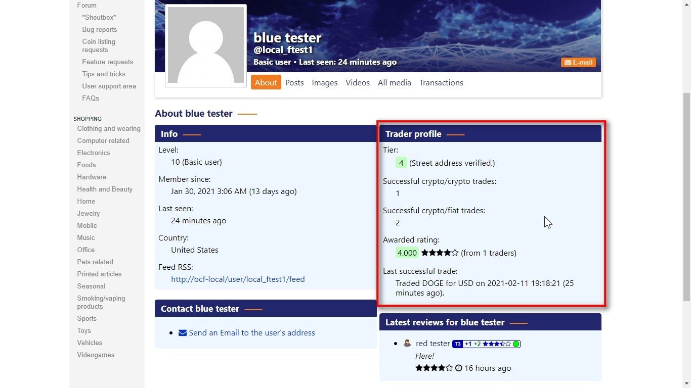 The executed trades counts are updated automatically. The rating is calculated over the submitted user reviews. After a successful trade on fiat markets, both the vendor and the customer can rate the interaction with the other and post a review, then that information is being shown in several places: