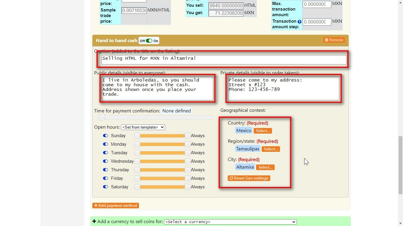 As you might notice, crypto/fiat payment methods may require a geographical context. That means you need to specify a level from as wide as a country to as narrow as a city.